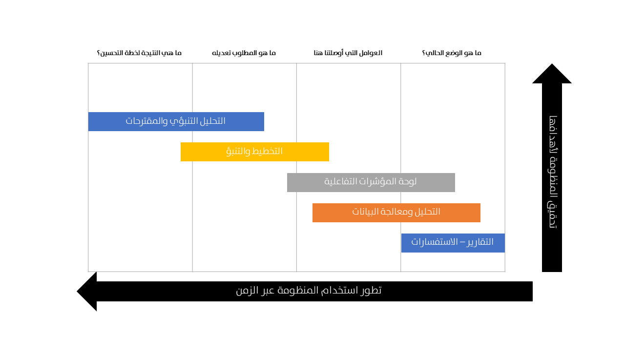 نظام المقترحات الذكي يتألف من مجموعة من المراحل التي توصل البرنامج ليقدم مقترحات مدعومة بالمؤشرات والقياسات والتجارب السابقة، والرسم البياني التالي يبين مراحل البرنامج ومكوناته ومستوى النضج المتراكم عبر زمن استخدامه: