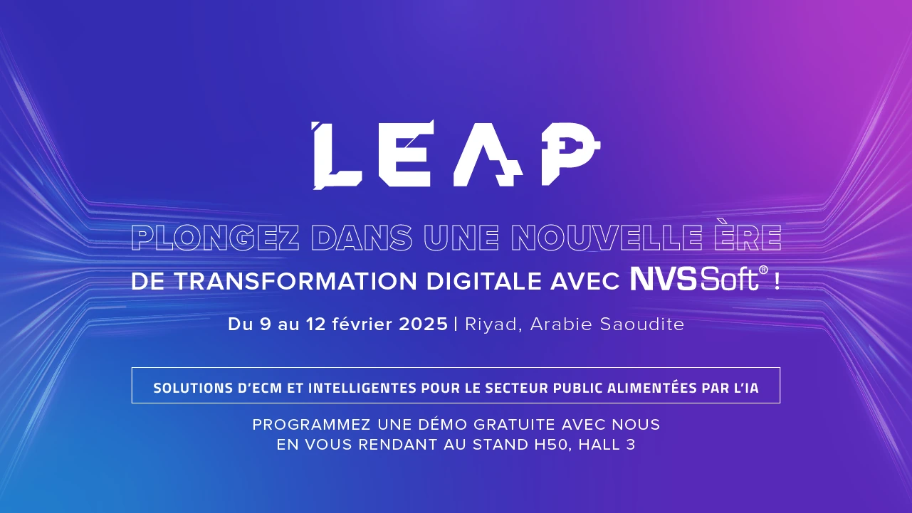Plongez dans un univers d’innovation technologique avec NVSSoft lors de LEAP 2025, l’événement dédié à la technologie le plus dynamique de la région, qui aura lieu du 9 au 12 février à Riyad, en Arabie Saoudite. Leader en solutions de gestion de l’information, NVSSoft est fier de de présenter en avant-première les derniers développements en matière de transformation digitale et de solutions intelligentes pour le secteur public, alimentés par l’IA.