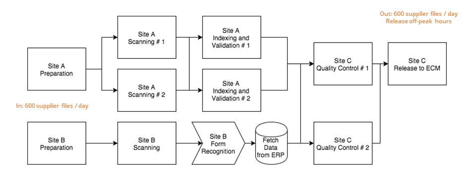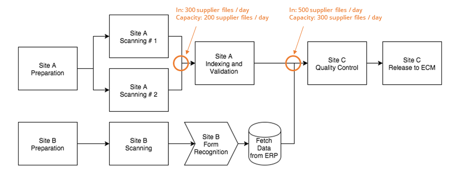 Workflow-based scanning is critical to ensure parallel operations and best use of resources. Take this scenario for example with a backfile conversion operation spanning two sites. A quick look at the throughputs shows that there are two bottlenecks and the final outcome of the operation is 300 supplier files per day scanned, indexed and released.